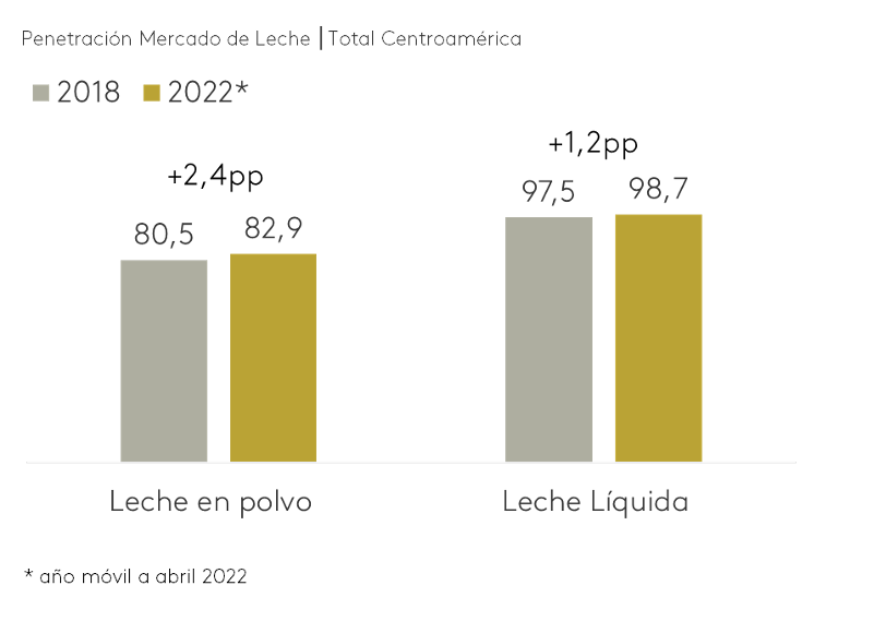 Esta categoría commodity ha logrado salirse de lo tradicional, innovando en sus variedades para cumplir con las necesidades de los centroamericanos, llegando a nuevos públicos meta y expandiendo su base de compradores un 7% en los últimos 5 años, este crecimiento impulsado en un 58% por el segmento de leche en polvo y un 42% por leche líquida, llegando así al 99,8% de hogares compradores.