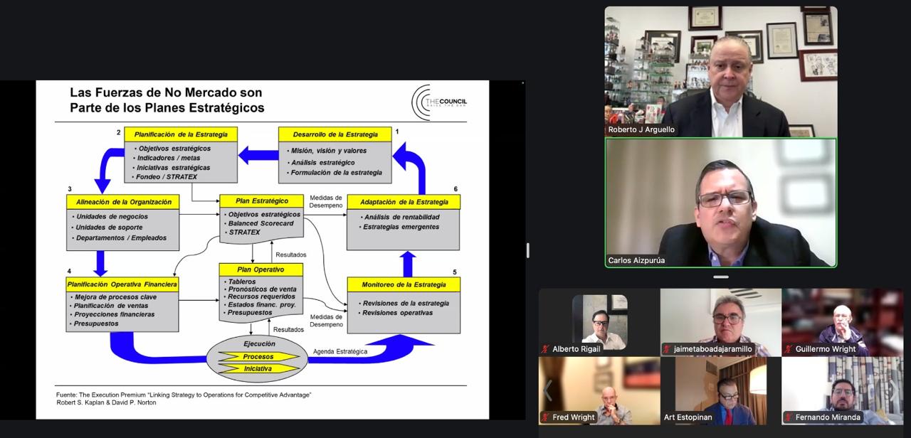 The Council es un “Think Tank” para analizar y desarrollar canales con personas claves como Arthur Estopinan, que tienen información y acceso a quienes están gobernando los Estados Unidos.  Además, resaltó la importancia de usar Power Maps, monitorear la banca y el comportamiento de los actores, proteger el core del negocio, pero sobre todo adaptar de manera emergente las estrategias conforme los escenarios se vayan dando.