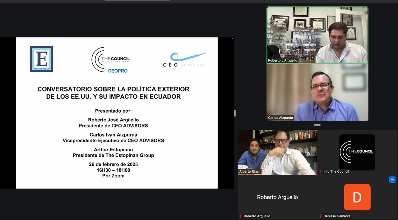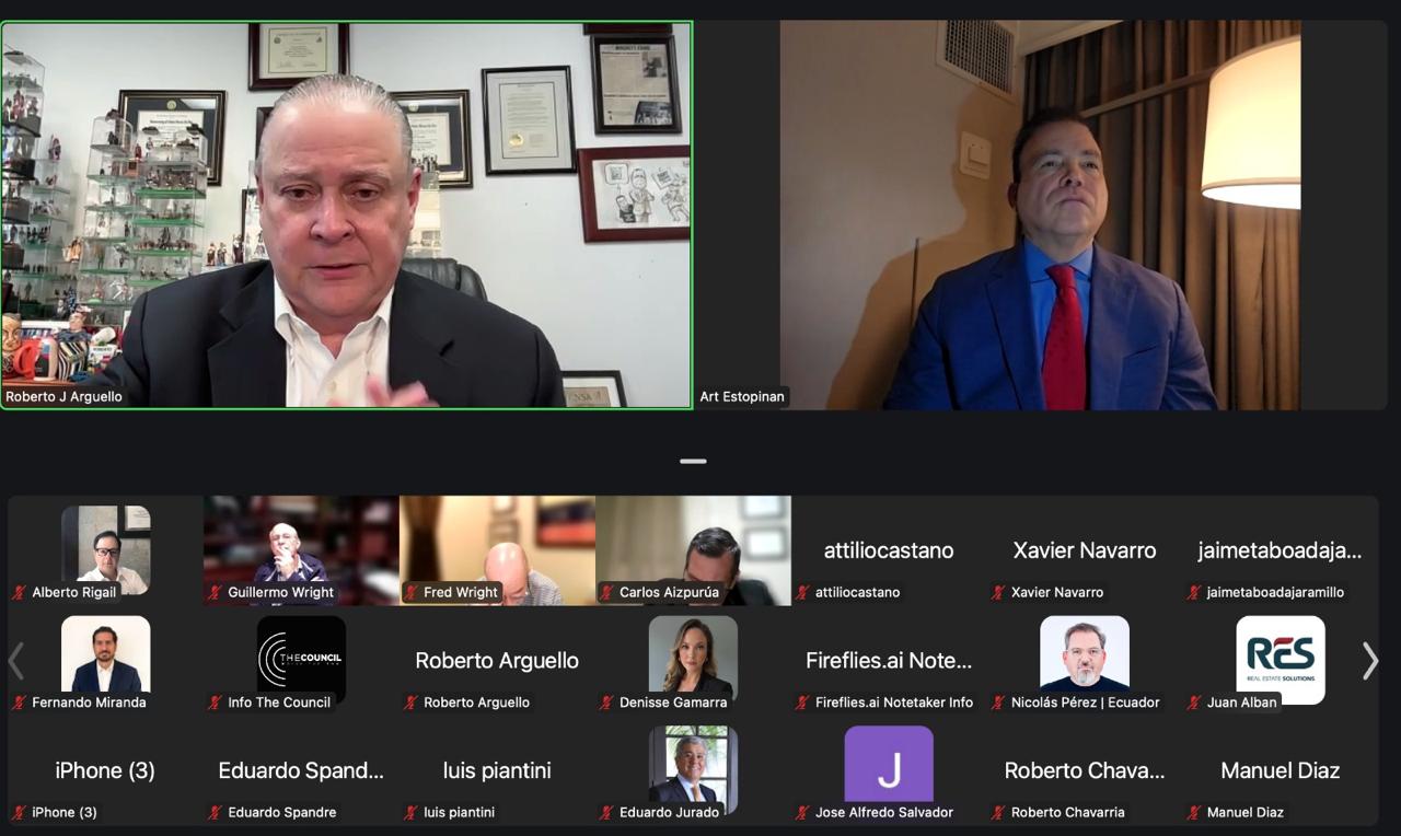 The Council, organización internacional con sede en Guayaquil, Ecuador, con más de 100 miembros, organizó exitosamente un conservatorio sobre la política exterior de los Estados Unidos y su posible impacto en las empresas ecuatorianas. Expusieron Roberto J. Argüello y Carlos Iván Aizpurúa, Presidente y Vicepresidente Ejecutivo de CEO ADVISORS, respectivamente, y Arthur Estopinan, Presidente del Estopinan Group, una de las más importantes firmas de Lobby en Washington DC.
