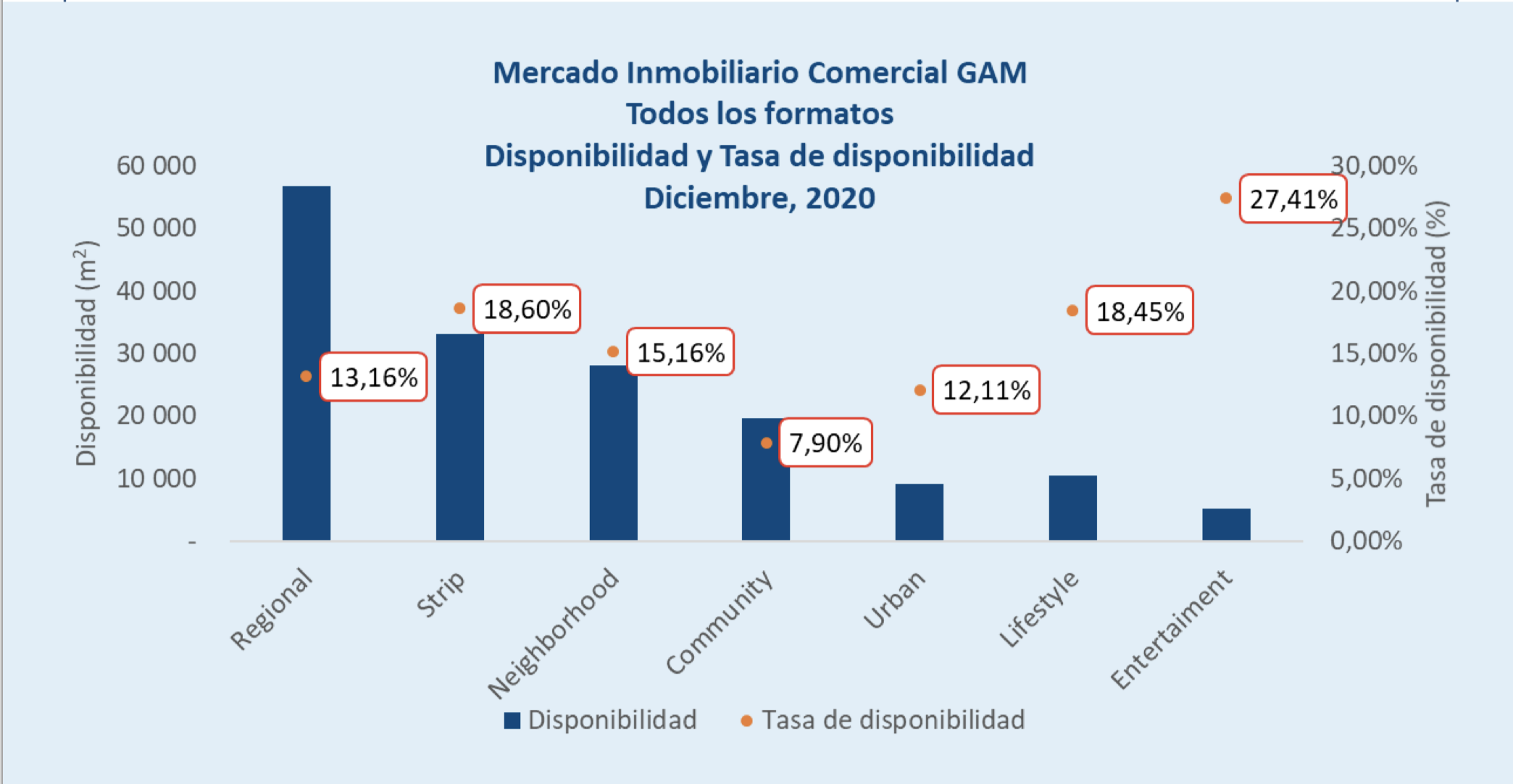 La tasa de disponibilidad más alta la presenta el formato Entertaiment Center con un 27,41%, sin embargo, el formato que a través de los años ha presentado siempre una tasa por encima de lo que se considera un mercado sano ha sido el Strip Center. Por su parte, el sector de Heredia presenta la tasa de disponibilidad más alta, el tener dos inmuebles con gran disponibilidad como lo son Oxígeno y Santa Verde, que ayudan a que esta tasa promedio siga creciendo.