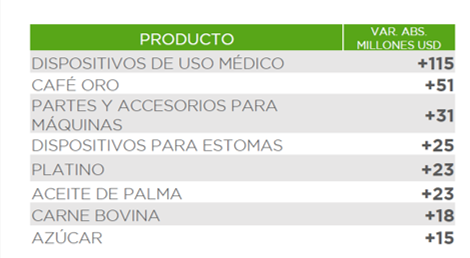 Finalmente, en términos de mercados, se presenta un crecimiento en América del Norte (+3%), explicado por aumento en los envíos de dispositivos médicos, aceite de palma y café oro; en Asia (+6%) por azúcar, carne bovina y carne de cerdo; y América del Sur (+12%) por jarabes para bebidas, dispositivos para estomas, pilas y baterías.
