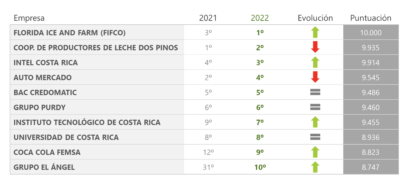 Florida Ice and Farm (FIFCO) asciende de la tercera a la primera posición, convirtiéndose en la empresa más responsable de Costa Rica en 2022. Cooperativa de Productores de Leche Dos Pinos ocupa la segunda posición e Intel Costa Rica la tercera, mientras que las siguientes compañías completan el top ten: Auto Mercado (4º), BAC Credomatic (5º), Grupo Purdy (6º), Instituto Tecnológico de Costa Rica (7º), Universidad de Costa Rica (8º), Coca Cola Femsa (9º) y Grupo El Ángel (10º).