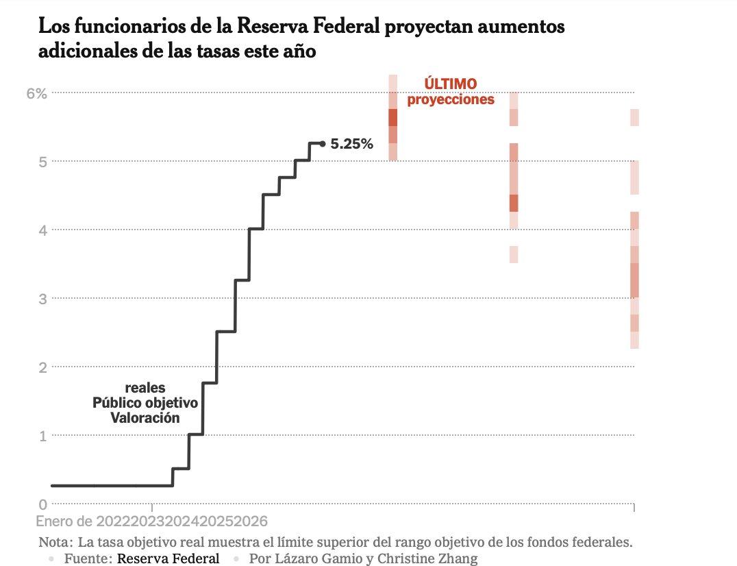 Pero los responsables de la política también predijeron en sus previsiones económicas que podrían aumentar aún más las tasas de interés, hasta el 5.6% a fines de 2023. Eso implicaría dos aumentos adicionales de un cuarto de punto porcentual durante las cuatro reuniones restantes de la Fed este año.