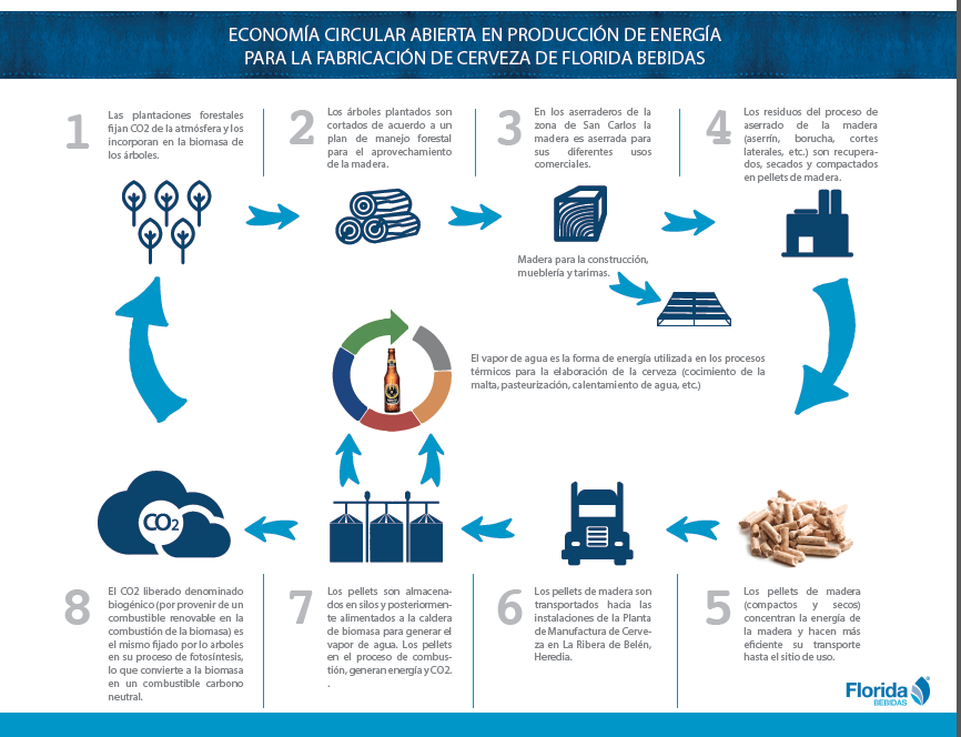 El combustible o biomasa que será empleado para alimentar la caldera de Florida Bebidas, cuyos proveedores son las empresas EcoSolutions y Pelletics, proviene de la zona de San Carlos. La empresa proveedora se encarga de recuperar la biomasa resultante de los residuos de aserraderos en los alrededores de la zona norte de Costa Rica. Estos residuos son posteriormente procesados para desarrollar los pellets, que consisten en pequeñas unidades de aglomerados de aserrín seco, los cuales, poseen una composición densa que los hace adecuados para la generación de calor y que son altamente eficientes como fuente energética.