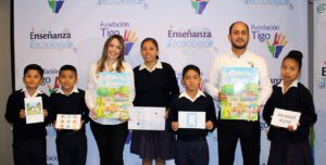 Melanie Reimers, directora ejecutiva de Fundación Tigo, Mario Leal, gerente de Educación de Fundación Tigo y estudiantes.