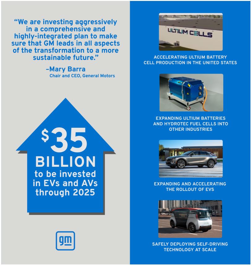 El anuncio se basa en el compromiso inicial de GM anunciado en marzo de 2020 de invertir US$20.000 millones, a partir de 2020 y hasta 2025, incluyendo los gastos de capital, ingeniería y otros costos de desarrollo, para acelerar su transición a vehículos eléctricos y autónomos. En noviembre de 2020, la compañía incrementó su inversión planificada durante el mismo periodo a US$27.000 millones.