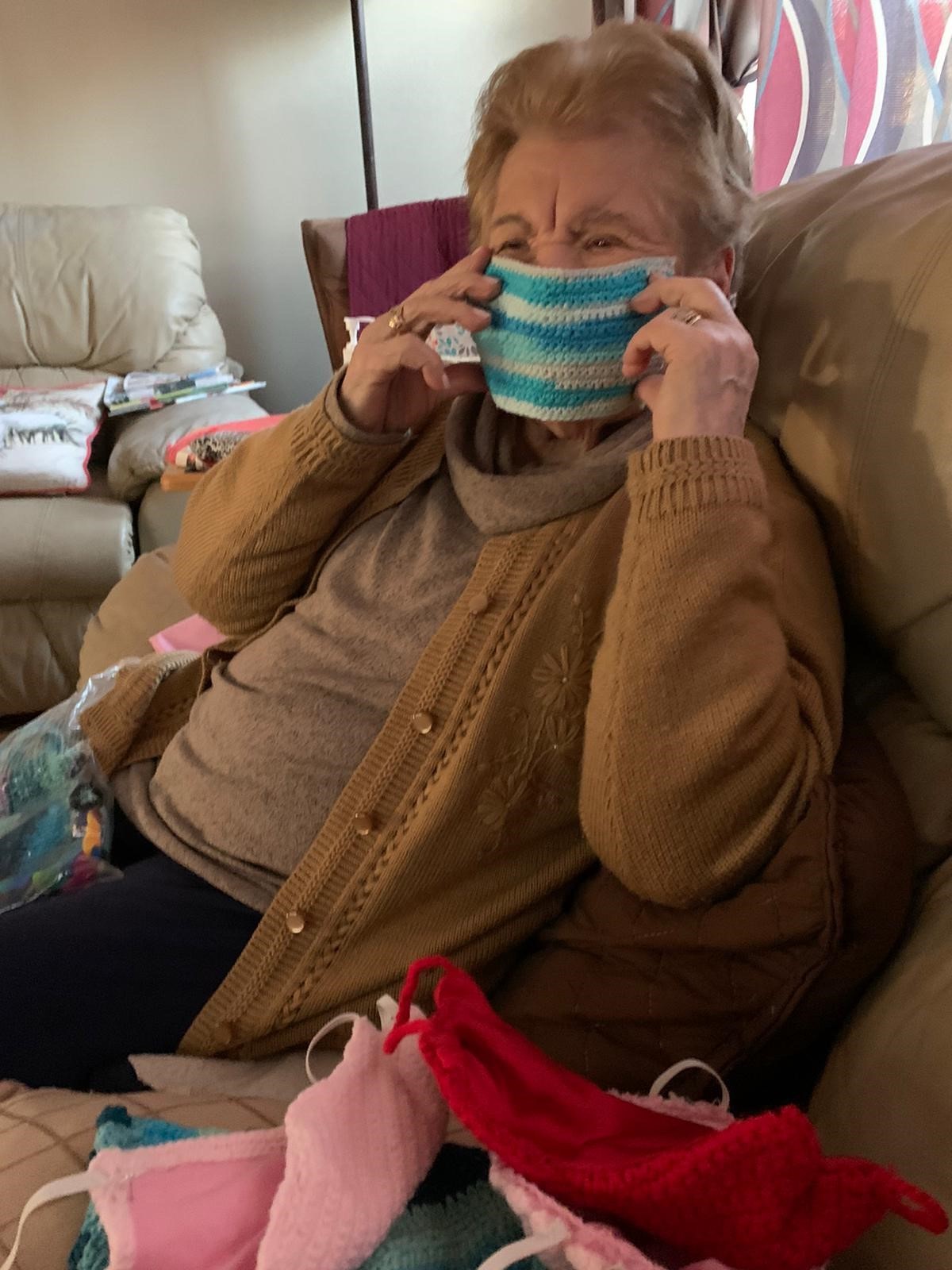 La Mamía, como cariñosamente le dicen algunos nietos y bisnietos, siempre tiene una palabra de aliento para alguien, un regalo para un nieto o un bisnieto, algo que tejió para el tataranieto que viene en camino. Sabe dónde estamos cada uno y qué estamos haciendo. No puedo dejar de compartirles esta foto donde modela uno de los cubre bocas que diligentemente tejió para mí; espero que la disfruten tanto como la disfruté yo.