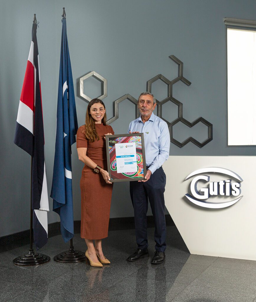 Esta entrega de Marca País se realizó en las instalaciones de Gutis, la Planta de Producción de medicamentos más moderna de Centroamérica, en presencia de Laura López, Gerente General de PROCOMER y el señor Norman Gutiérrez Gerente General.