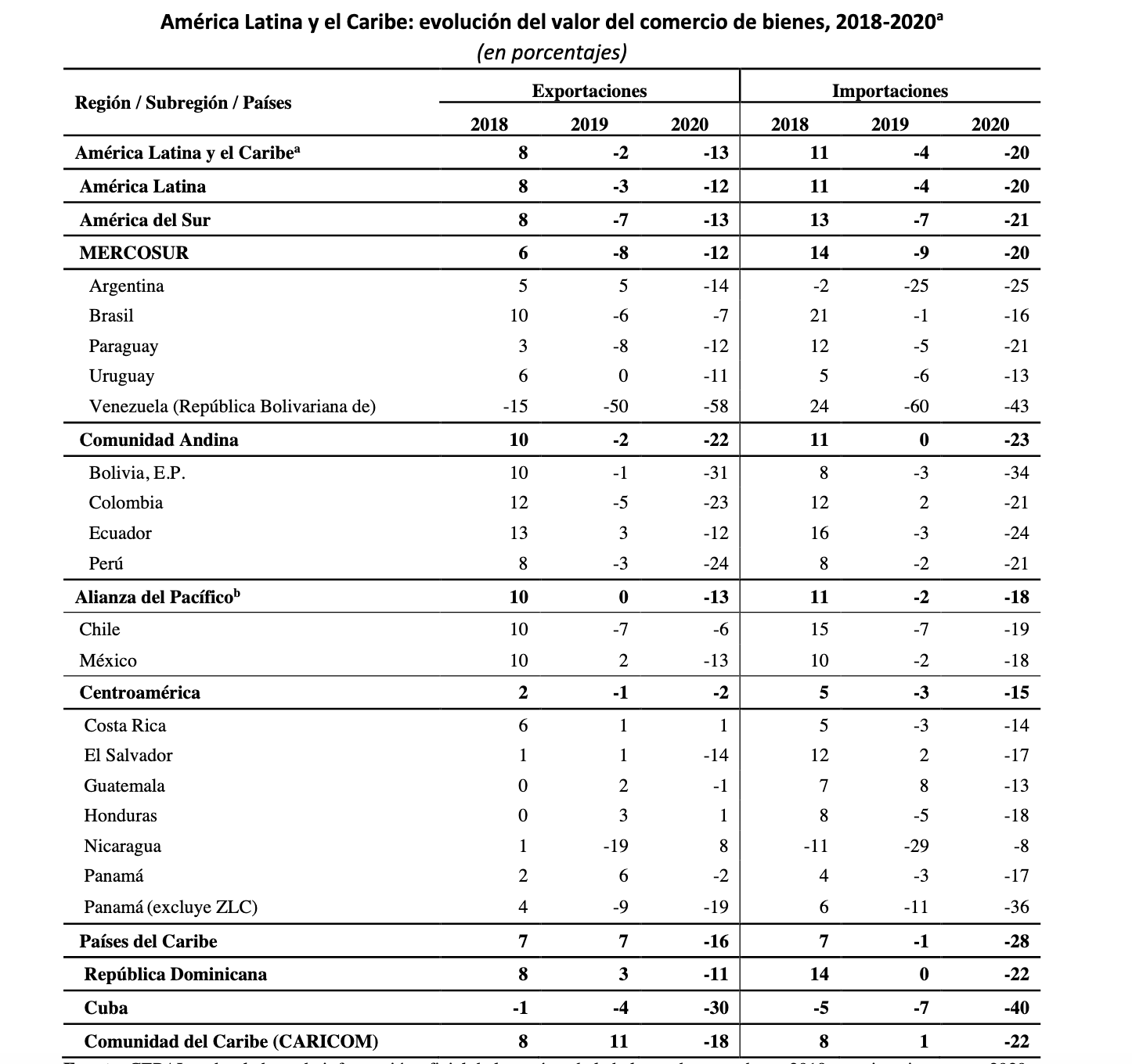 El comercio exterior de América Latina y el Caribe tuvo en 2020 su peor desempeño desde la crisis financiera mundial de 2008-2009 sobre todo a causa de la crisis económica generada por la pandemia global del COVID-19 y las restricciones impuestas por los gobiernos para frenar su propagación. Según nuevas proyecciones de la CEPAL, se estima que el valor de las exportaciones regionales disminuyó un -13%, mientras que las importaciones se redujeron en -20% durante el año 2020, señaló el organismo de las Naciones Unidas al dar a conocer una nueva edición de su informe anual Perspectivas del Comercio Internacional de América Latina y el Caribe 2020.