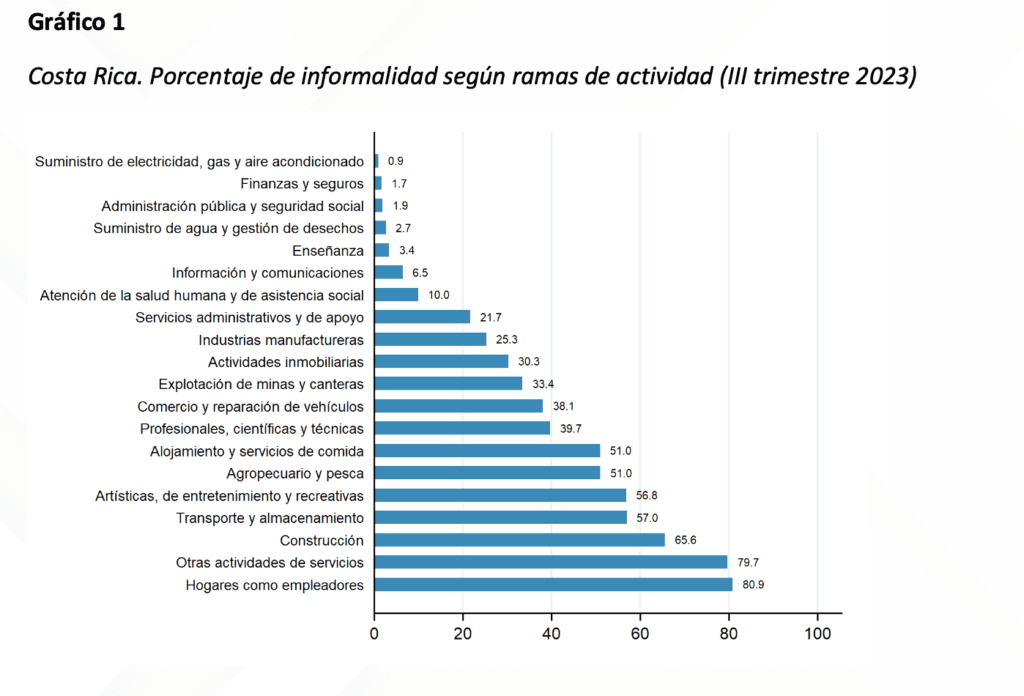 En el III trimestre de 2023 el porcentaje de empleo informal en Costa Rica fue de 38,3%, encontrándose dentro del rango de 36% a 47% de los últimos trece años. Sin embargo, este resultado dista mucho del observado en las veinte ramas de actividad que conforman la economía nacional, los cuales oscilan entre el 0,9% y el 81%.