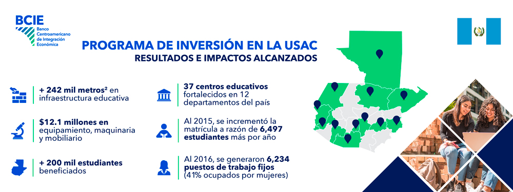 El Banco Centroamericano de Integración Económica (BCIE) desde hace 29 años ha desempeñado un papel fundamental en el desarrollo de la educación superior al impulsar un Programa de inversión en infraestructura, maquinaria y equipo para la Universidad de San Carlos de Guatemala (USAC) que fomenta mejores condiciones de acceso y calidad a favor de la población estudiantes del país.