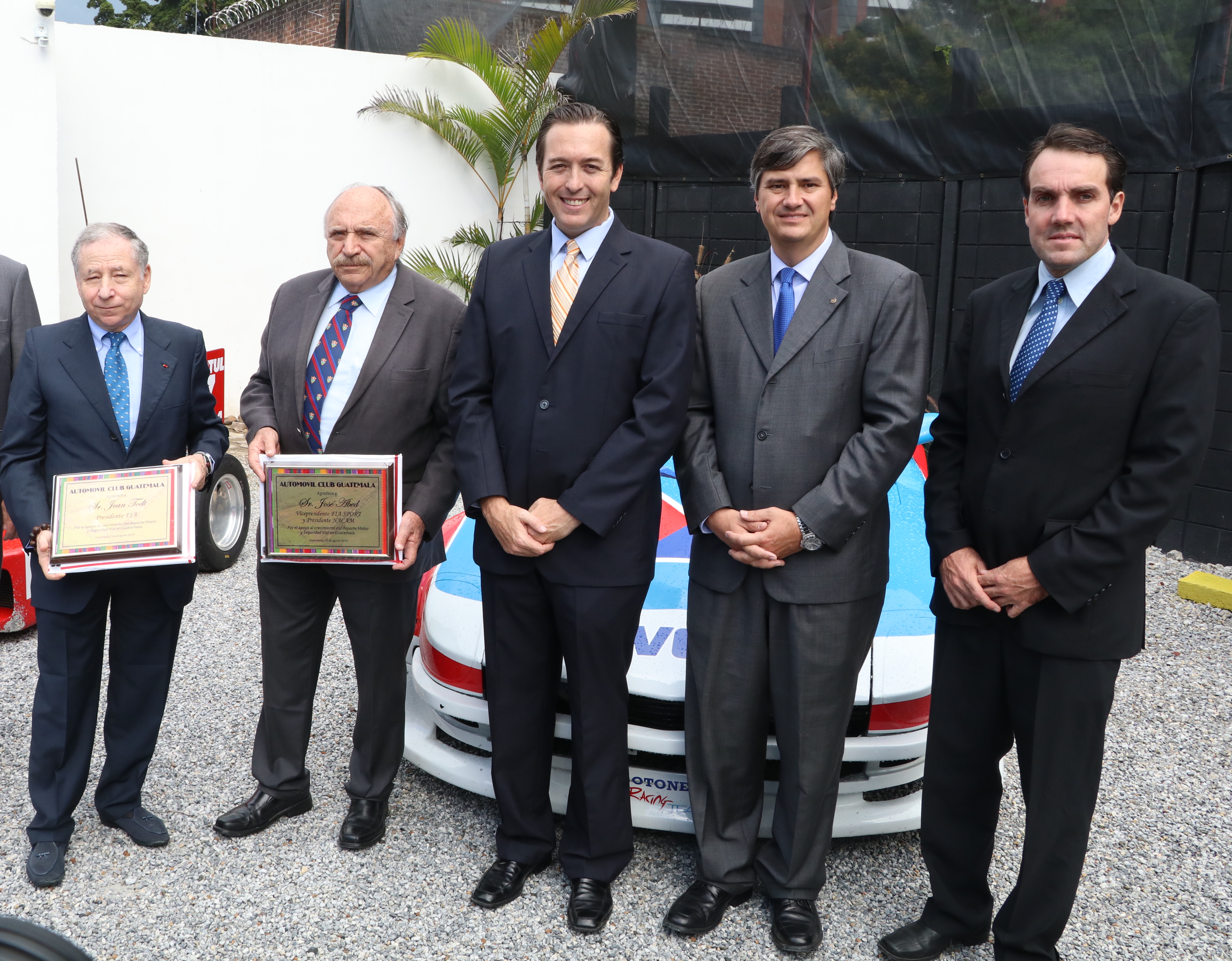 Jean Todt, presidente FIA, José Abed, vicepresidente FIA, Pedro Cofiño, presidente Automóvil Club Guatemala, Juan Carlos Botrán, director de Seguridad Vial Automóvil Club Guatemala y Mauricio Roque, vicepresidente Automóvil Club Guatemala.