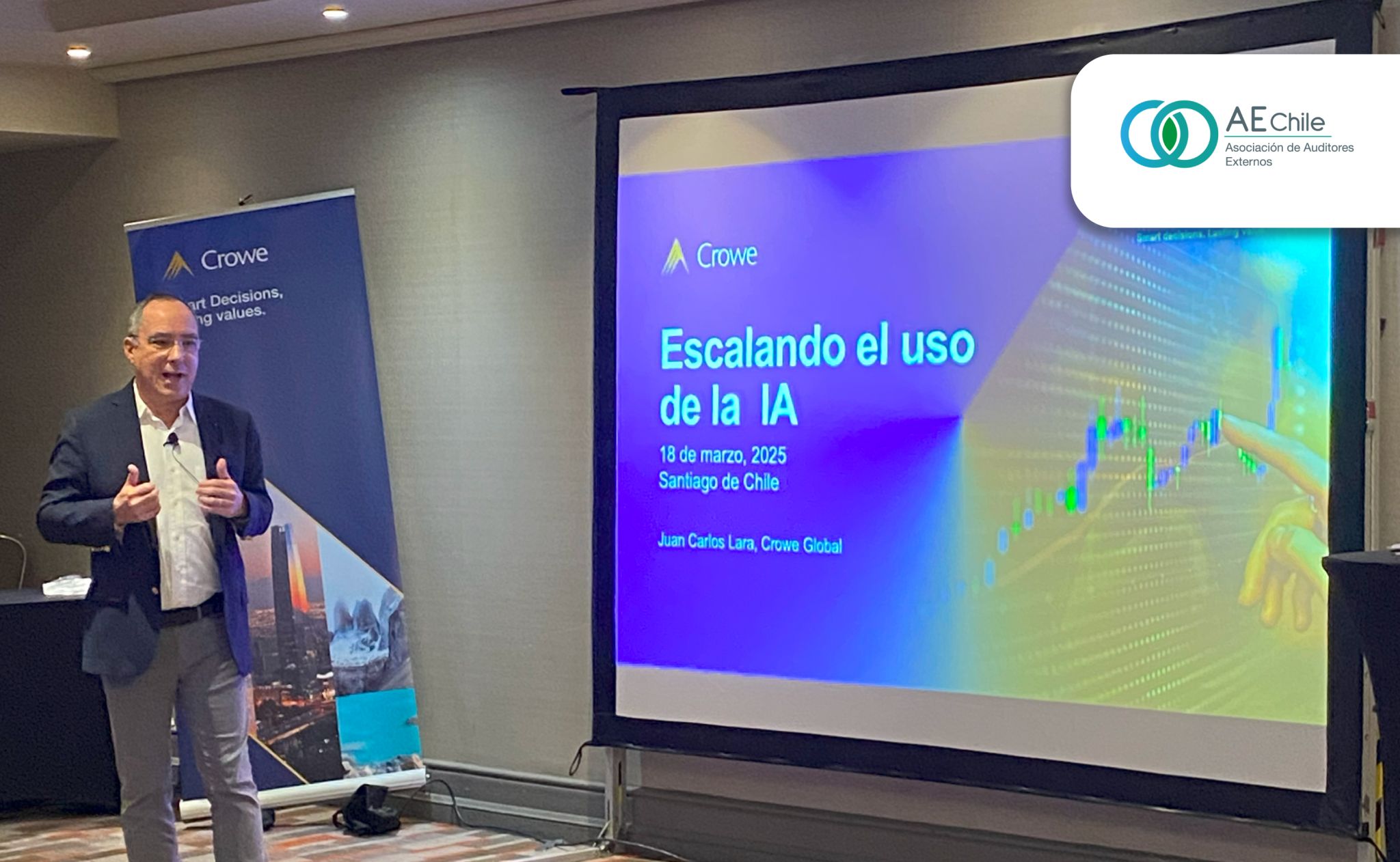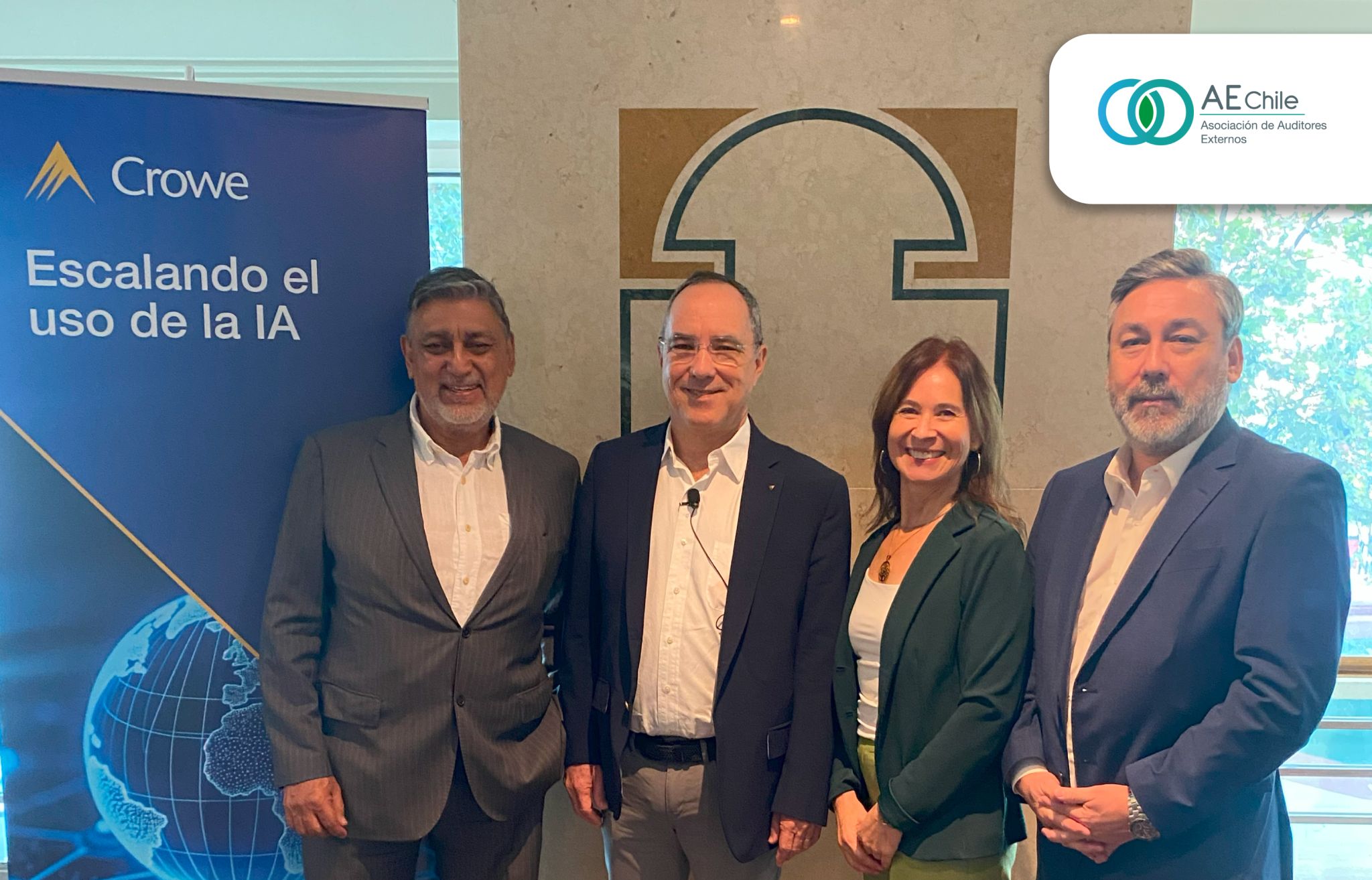 Crowe Chile organizó la charla “Escalando el uso de la IA”, en la que participaron representantes de las firmas que conforman la Asociación de Auditores Externos de Chile A.G. (AE Chile). En dicha actividad, Juan Lara, director regional de Crowe Global, compartió su visión sobre los beneficios y precauciones en la implementación de la en la profesión.