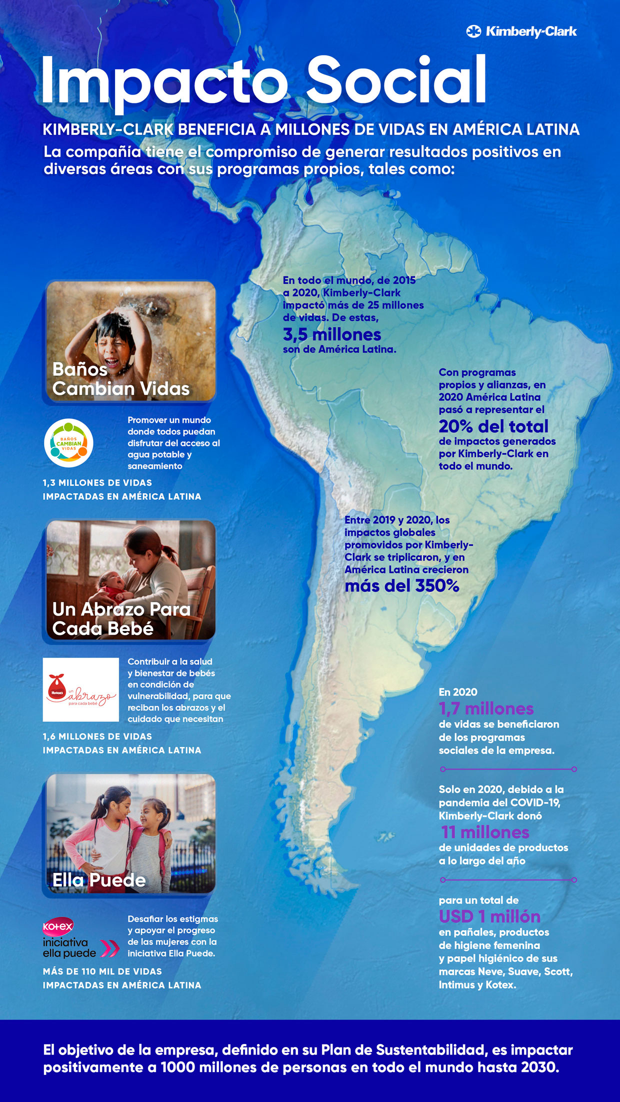 En 2020, la cantidad de vidas impactadas por Kimberly-Clark en América Latina creció un 350% en comparación con 2019, mediante programas sociales establecidos como Baños Cambian Vidas, Un Abrazo para Cada Bebé y la iniciativa Ella Puede. Las acciones en alianza con organizaciones no gubernamentales como Plan International, Cruz Roja y Bancos de Alimentos, alcanzaron 1,7 millones de personas en el período, incluidos los profesionales de salud de la primera línea y las comunidades en condición de vulnerabilidad de la región. Además, se donaron un total de 11 millones de unidades de productos como parte de los esfuerzos de ayuda contra el COVID-19 -el equivalente a US$ 1 millón en papel higiénico, pañales y productos para la higiene femenina-.