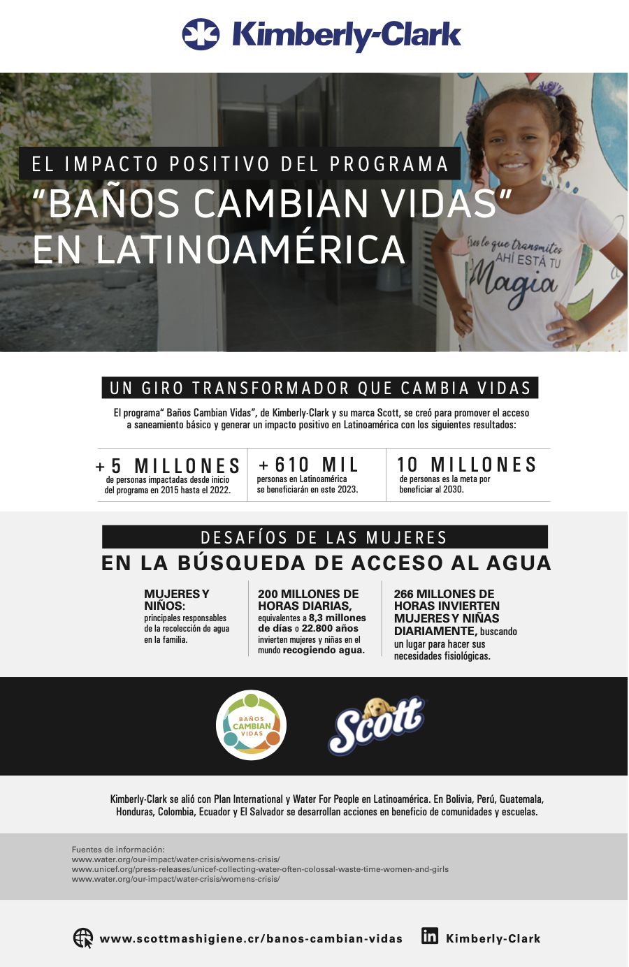 Como parte de su compromiso para abordar esta problemática de saneamiento, este año Kimberly-Clark, a través de su marca Scott® renovó la alianza con Water for People para continuar con las acciones de «Baños Cambian Vidas» en Bolivia, Perú, Guatemala y Honduras, y continúa trabajando con Plan International para el apoyo a Colombia, Ecuador y El Salvador. Desde su implementación, ha impactado a más de 5 millones de personas a nivel regional, y aspira alcanzar a más de 10 millones de vidas hacia el 2030.