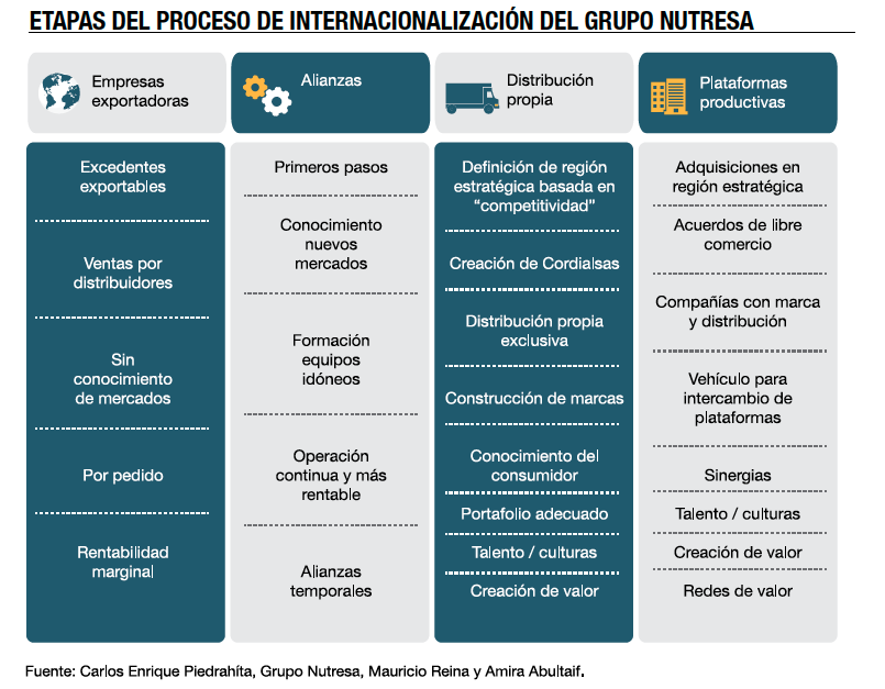 Entre el 2000 y el 2015, las ventas totales del Grupo Nutresa aumentaron 12 veces, para llegar a los 8.000 millones de pesos (US$2.700 millones), un dinamismo que abarca su desempeño en el mercado colombiano y el internacional. Gracias a la estrategia de internacionalización, las ventas en el exterior de Nutresa se multiplicaron 25 veces en este periodo, al pasar de US$44,5 millones a US$1.098 millones, en el 2015. De esta manera, la participación de las ventas interna cionales en las ventas totales pasó de ser un 4%, en el 2000, a un 38% en el 2015.