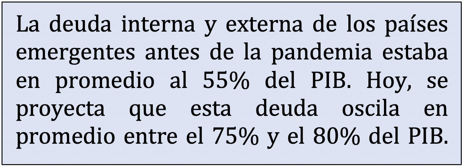 Al escenario descrito anteriormente hay que sumarle que la deuda interna y externa de los países emergentes antes de la pandemia estaba en promedio al 55% del PIB. Hoy, los principales economistas del mundo proyectan que esta deuda oscila en promedio entre el 75% y el 80% del PIB. Esta es una cifra astronómica e inmanejable para nuestros países.