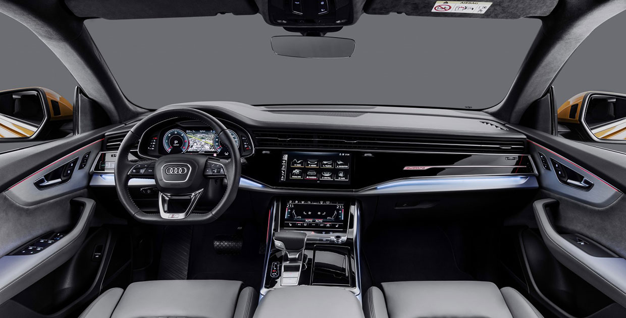 Con el concepto operacional de respuesta táctil MMI del nuevo Audi Q8, se puede acceder a casi todas las funciones a través de dos pantallas grandes. La pantalla superior de 10.1 pulgadas se utiliza para controlar los sistemas de infotainment y de navegación. La pantalla inferior de 8.6 pulgadas permite al conductor manejar las funciones de climatización, confort y de entrada de texto, mientras que la mano del conductor descansa cómoda y ergonómicamente en la palanca selectora.