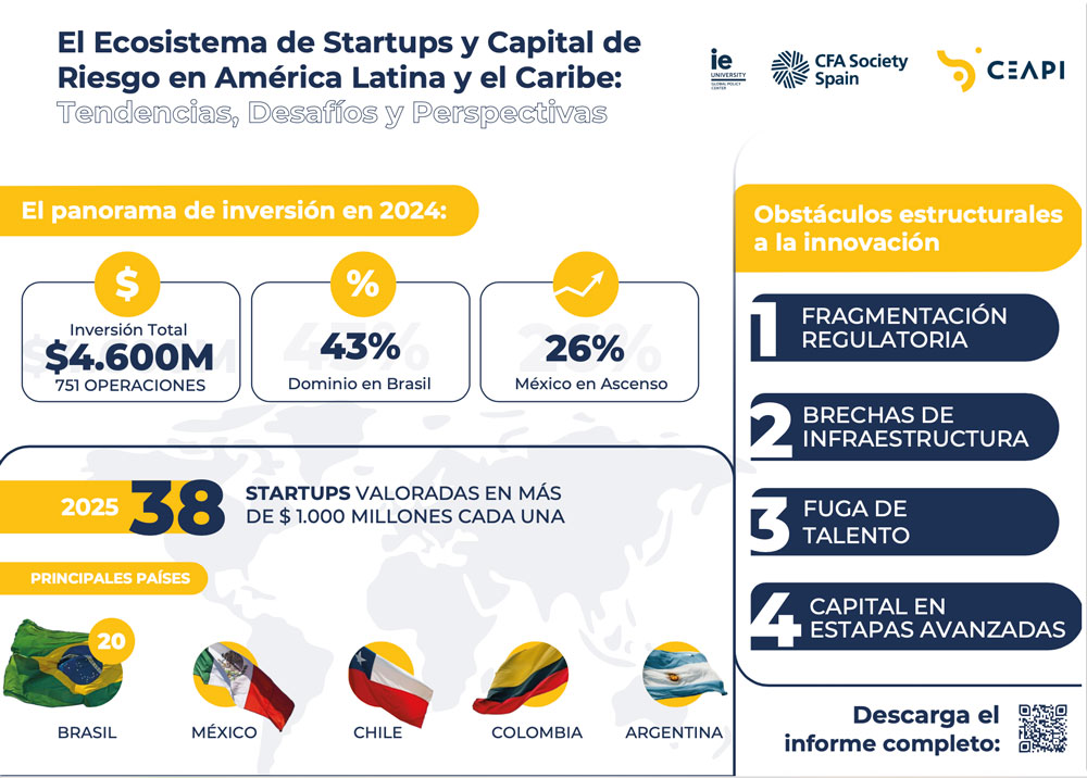 “A mediados de 2025, América Latina y el Caribe cuenta con 38 unicornios – startups valoradas en más de US$ 1.000 millones-, impulsados por la digitalización, la inclusión financiera y la expansión del capital de riesgo”. Así lo destaca el estudio El Ecosistema de Startups y Capital de Riesgo en América Latina y el Caribe: Tendencias, Desafíos y Perspectivas, elaborado por el Consejo Empresarial Alianza por Iberoamérica (CEAPI) junto a IE University, y con el apoyo de CFA Society Spain, y presentado este lunes en el Paper Pavilion de IE University. El documento analiza la evolución, desafíos y perspectivas del ecosistema de startups y capital de riesgo en América Latina y el Caribe.
