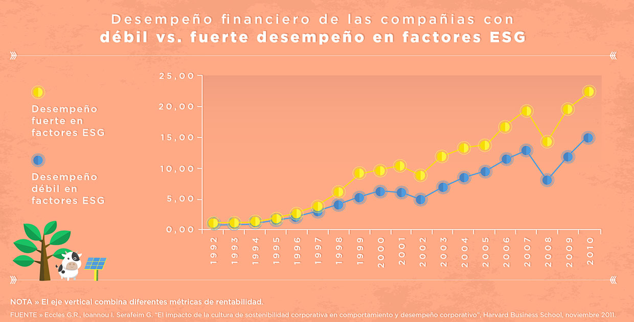 Un estudio de la Universidad de Harvard, sobre un total de 90 empresas públicas en el mundo y en más de 30 sectores, muestra el beneficio incremental que obtuvieron aquellas empresas con elevados estándares de sostenibilidad, respecto de otro grupo que le dio menor importancia relativa. Si bien la investigación fue hecha en 2012, esta tendencia sigue acentuándose.
