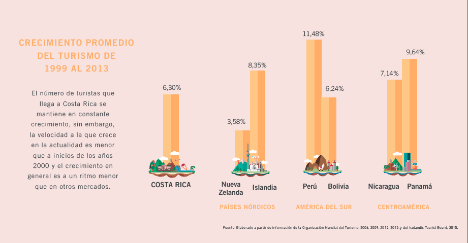 Costa Rica es un mercado relativamente consolidado en cuanto al turismo y mantiene un crecimiento constante en la cantidad de turistas, pero la velocidad a la que se crece en la actualidad es menor que a inicios de los años 2000, y el crecimiento en general menor que en otros mercados de la región como Nicaragua, Panamá o Perú. Según el estudio, Costa Rica es clasificada como un país de ingreso medio alto, con características políticas, económicas y sociales singulares. La actividad turística ha sido una de las áreas económicas estratégicas desde los años noventa registrando un crecimiento sostenido en la llegada de turistas.