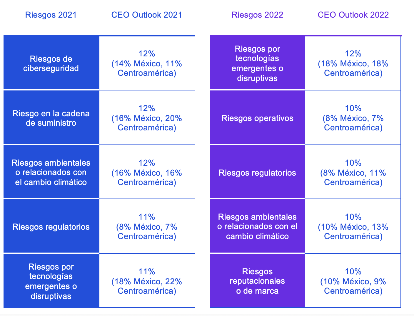 La ciberseguridad ha caído de los cinco principales riesgos para el crecimiento durante 2022, con solo 6% (8% México, 4% Centroamérica) nombrándolo su principal riesgo. Sin embargo, el ambiente informático evoluciona y 76% (86% México, 84% Centroamérica) indica que su organización ve la ciberseguridad como una función estratégica y como una posible fuente de ventaja competitiva. La incertidumbre geopolítica también genera inquietudes de ciberataques corporativos, de acuerdo con siete de cada diez encuestados (72% Global, 76% México, 93% Centroamérica).