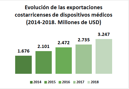 La industria de dispositivos médicos que se desarrolla en Costa Rica continúa dando pasos firmes en los mercados internacionales. En el 2018, este sector se posicionó como el principal exportador de bienes del país con un 29% de participación y ventas por US$3.247 millones, un 19% más que en el 2017.