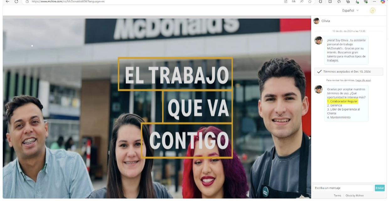 Los interesados en formar parte del equipo de McDonald’s también pueden postularse ingresando a:  https://www.mchire.com/co/McDonalds4606?language=es, en donde deberán elegir la opción: Colaborador Regular y seguir los pasos para completar su solicitud.