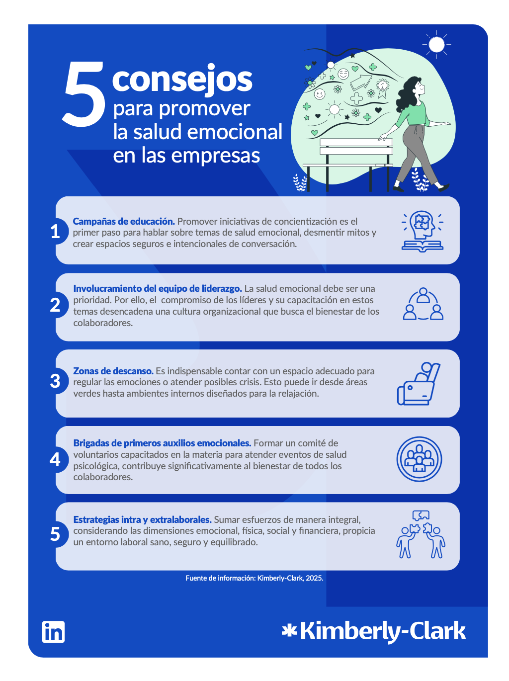Por esta razón, las políticas de salud emocional se han convertido en una necesidad para cuidar el entorno laboral, a los trabajadores y los objetivos del negocio. En esa misma línea, para Kimberly-Clark el bienestar de sus colaboradores siempre ha sido una prioridad. Desde hace cinco años, la compañía desarrolla una estrategia global de bienestar que contempla cuatro pilares: emocional, físico, social y financiero.