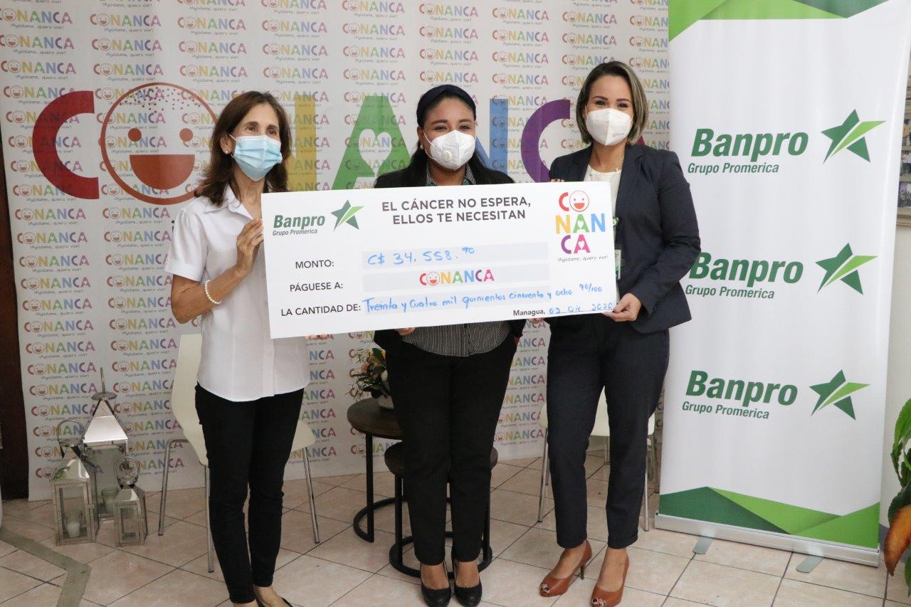 En nombre de Banpro Grupo Promerica, María Elena Alvarez, gerente de la sucursal Zumen y Cristian Hernández, coordinadora de relaciones públicas de la institución financiera entregaron a la Comisión Nicaragüense de Ayuda al Niño con Cáncer (CONANCA) un donativo por C$ 34.558,90 córdobas para que continúe con su labor altruista de ayudar a los infantes que padecen esta enfermedad.