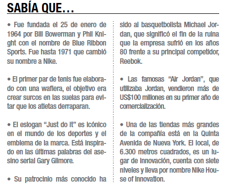 Nike está presente en todo el mundo, sus productos parecen estar destinados a ser exitosos, solo en Estados Unidos se distribuyen a más de 19.000 minoristas y sus ingresos anuales sobrepasan los US$25.000 millones. La marca por sí sola tiene un valor de US$15.900 millones, lo que la convierte en la más valiosa entre las corporaciones deportivas.