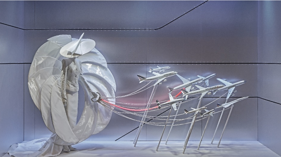 Para encarnar y dar vida a 90 años de elegancia, Air France presenta una colección de cinco vestidos emblemáticos creados por Xavier Ronze, diseñador francés y jefe de los talleres de diseño de vestuario del Ballet de la Ópera de París. Cada vestido interpreta los diferentes aspectos de la identidad de la compañía aérea: aviones y tecnología, uniformes y moda, afiches emblemáticos que promocionan su amplia red, gastronomía y artes de la mesa, diseño y arquitectura.