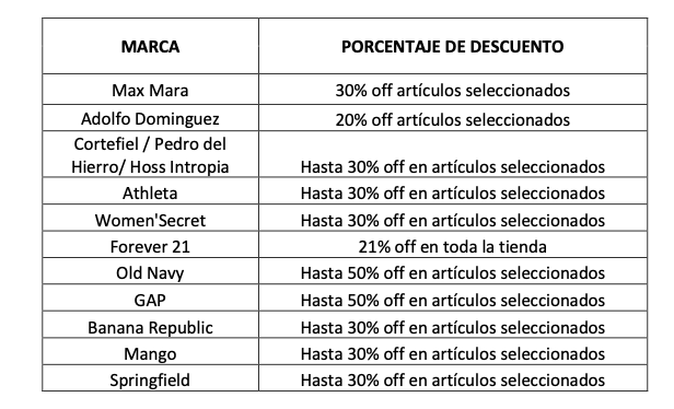 Se trata de varios días de descuentos que ofrece AR Holdings en más de 10 marcas internacionales: Forever 21, Old Navy, GAP, Athleta, Women’Secret, Banana Republic, Mango, Springfield, Max Mara, Adolfo Domínguez, Cortefiel, Pedro del Hierro y Hoss Intropia.