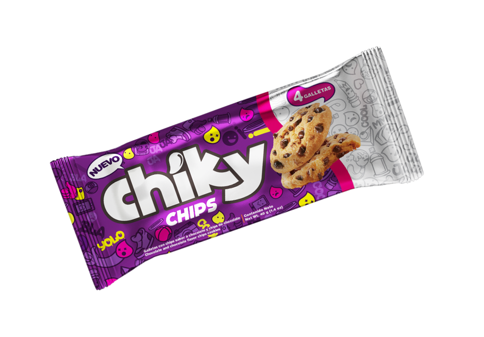 Directo al grano, o, mejor dicho, directo a las chispas de chocolate; las nuevas galletas Chiky Chips innovan por su forma redondeada y textura rugosa, características que combinan a la perfección con su poderosa inclinación por el apasionante sabor a chocolate de este nuevo producto. Estas galletas vienen en paquetes de cuatro unidades y una presentación que contiene 6 paquetes, para 24 galletas en total. Este es el nacimiento de una nueva forma de ver y comer las galletas Chiky que siempre han encantado a sus consumidores.