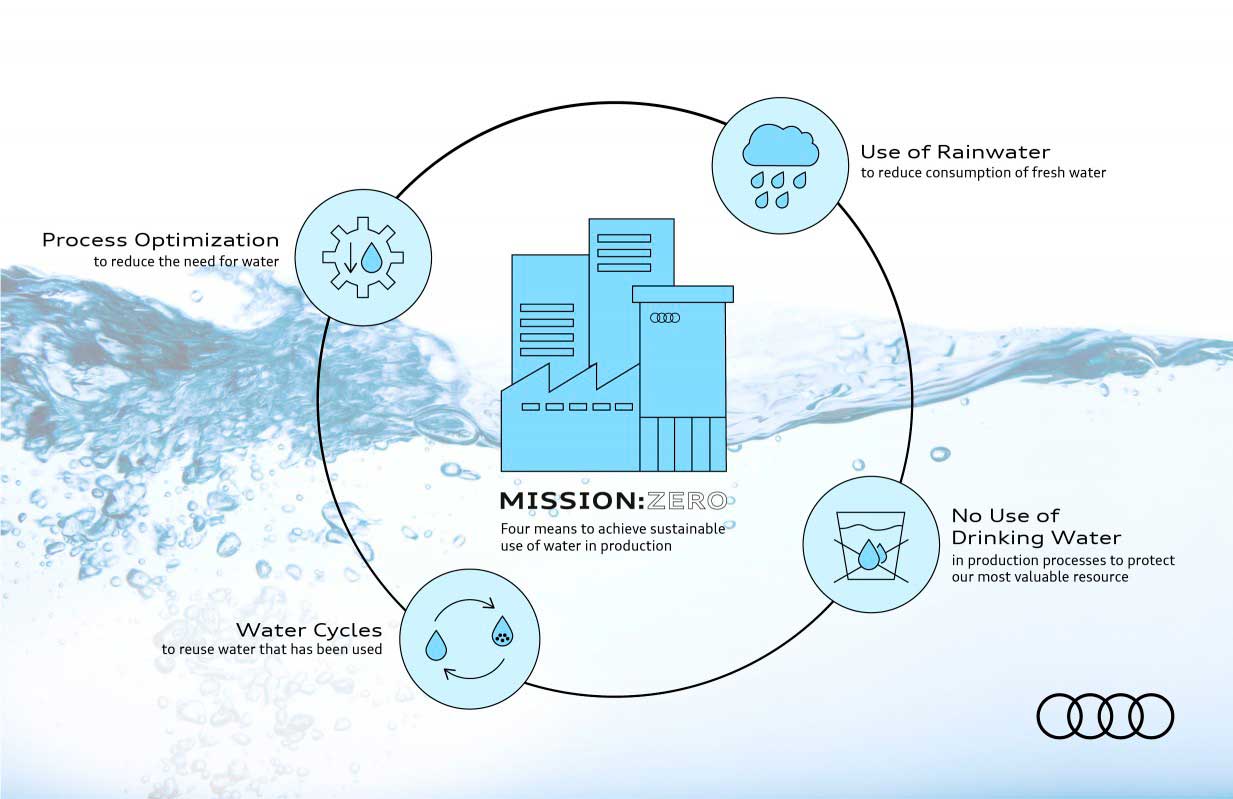 El agua potable es uno de los recursos más valiosos en todo el mundo: por eso Audi ha incluido el uso económico y eficiente del agua como un aspecto clave de su programa medioambiental Mission:Zero. La compañía planea mantener su propio consumo de agua al mínimo y dejar de usar agua potable en la producción de vehículos en el futuro. Con este fin, Audi está implementando procesos eficientes y ciclos de agua cerrados, aumentando el uso de agua de lluvia. A largo plazo, planea implementar ciclos de agua cerrados en todas sus plantas de producción.