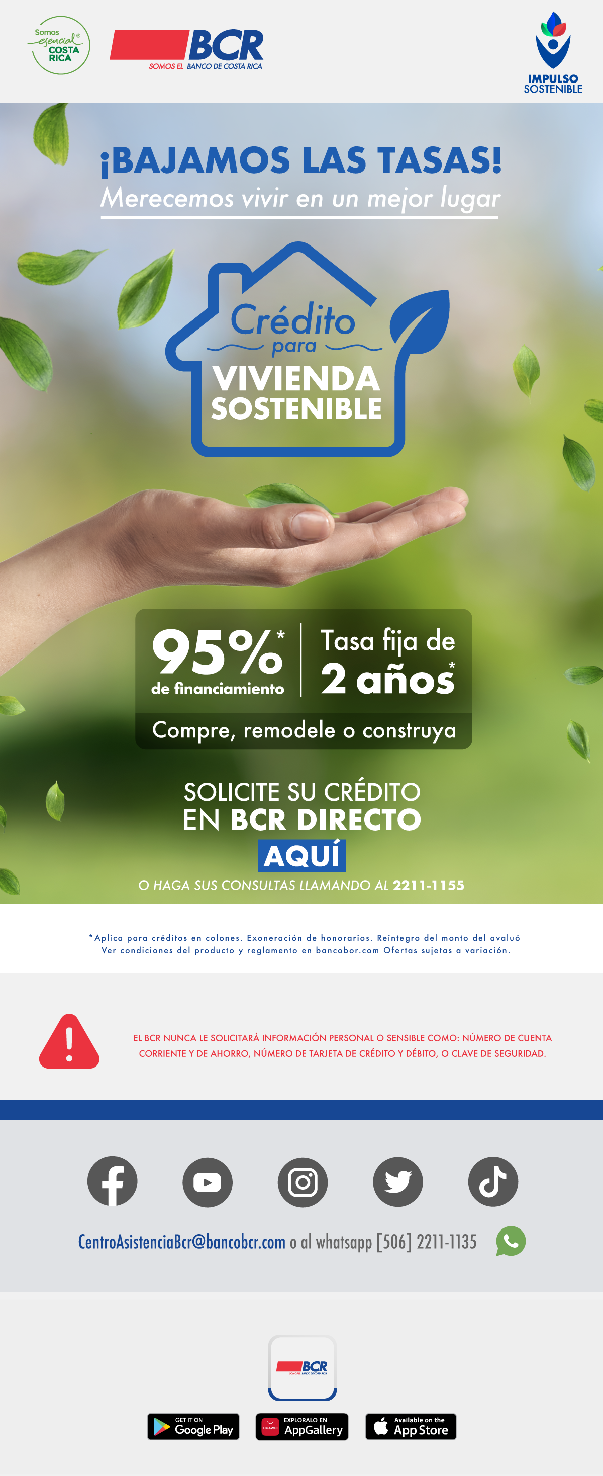 Esta oferta crediticia está disponible en colones, con una tasa fija durante los primeros dos años al 8,25% y el resto del plazo TBP + 4,25%; con un plazo de hasta 30 años.