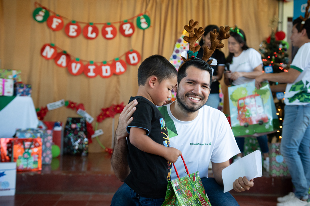 La dinámica de los regalos fue especialmente significativa, ya que los colaboradores de la institución financiera tuvieron la oportunidad de apadrinar a un niño y cumplir sus deseos de Navidad. Algunos colaboradores tuvieron el privilegio de asistir personalmente a la celebración, compartiendo momentos de alegría y entregando los regalos a los niños. Además, los participantes expresaron su gratitud a Banco Promerica a través de manualidades y cartas de agradecimiento.