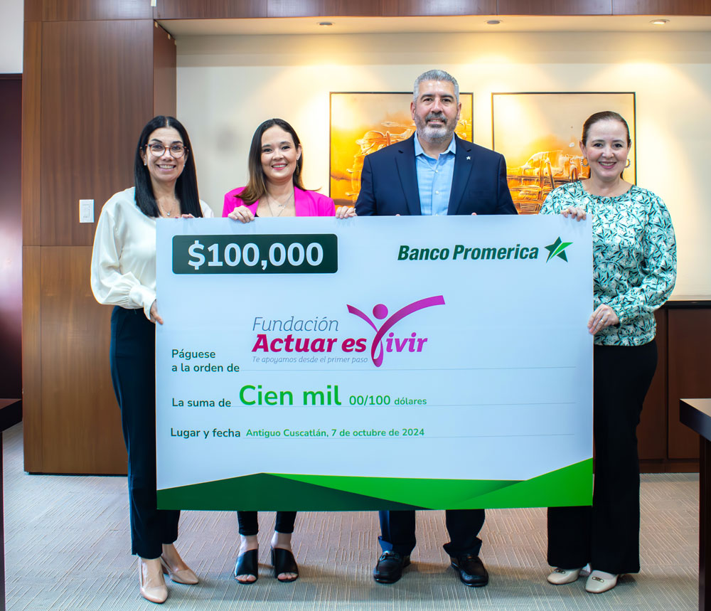 Banco Promerica El Salvador realiza por décimo año consecutivo un donativo de US$100.000 a la Fundación Actuar es Vivir (Fundactuar). Este aporte tiene como objetivo apoyar la detección temprana del cáncer de mama y cérvix en mujeres en situación de vulnerabilidad, asegurando el acceso a chequeos médicos esenciales para su bienestar.