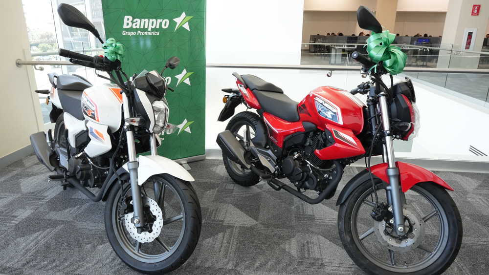 Los jóvenes José Alberto Barahona, técnico de recuperaciones y Kevin Jimenez, supervisor de recuperaciones de la gerencia de riesgo de crédito de personas de Banpro Grupo Promerica salieron favorecidos con una motocicleta cada uno, por haberse destacado durante el 2025.