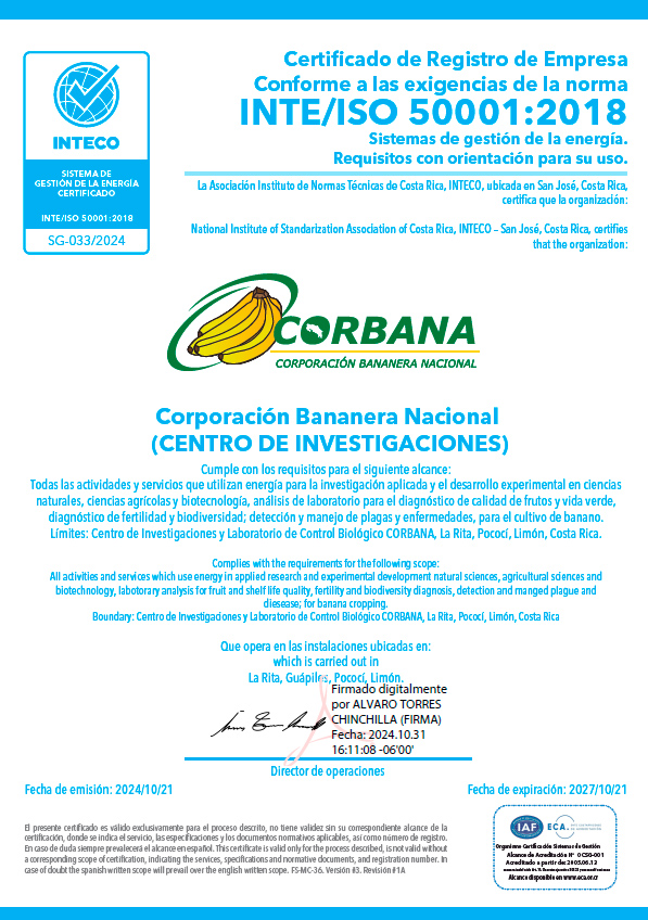 La Corporación Bananera Nacional (CORBANA) ha obtenido la certificación de su Sistema de Gestión de Energía bajo la norma INTE/ISO 50001:2018, otorgada por el Instituto de Normas Técnicas de Costa Rica (INTECO). Esta certificación aplica a las actividades y servicios que utilizan energía en el Centro de Investigaciones, ubicado en La Rita, Pococí, Limón​.