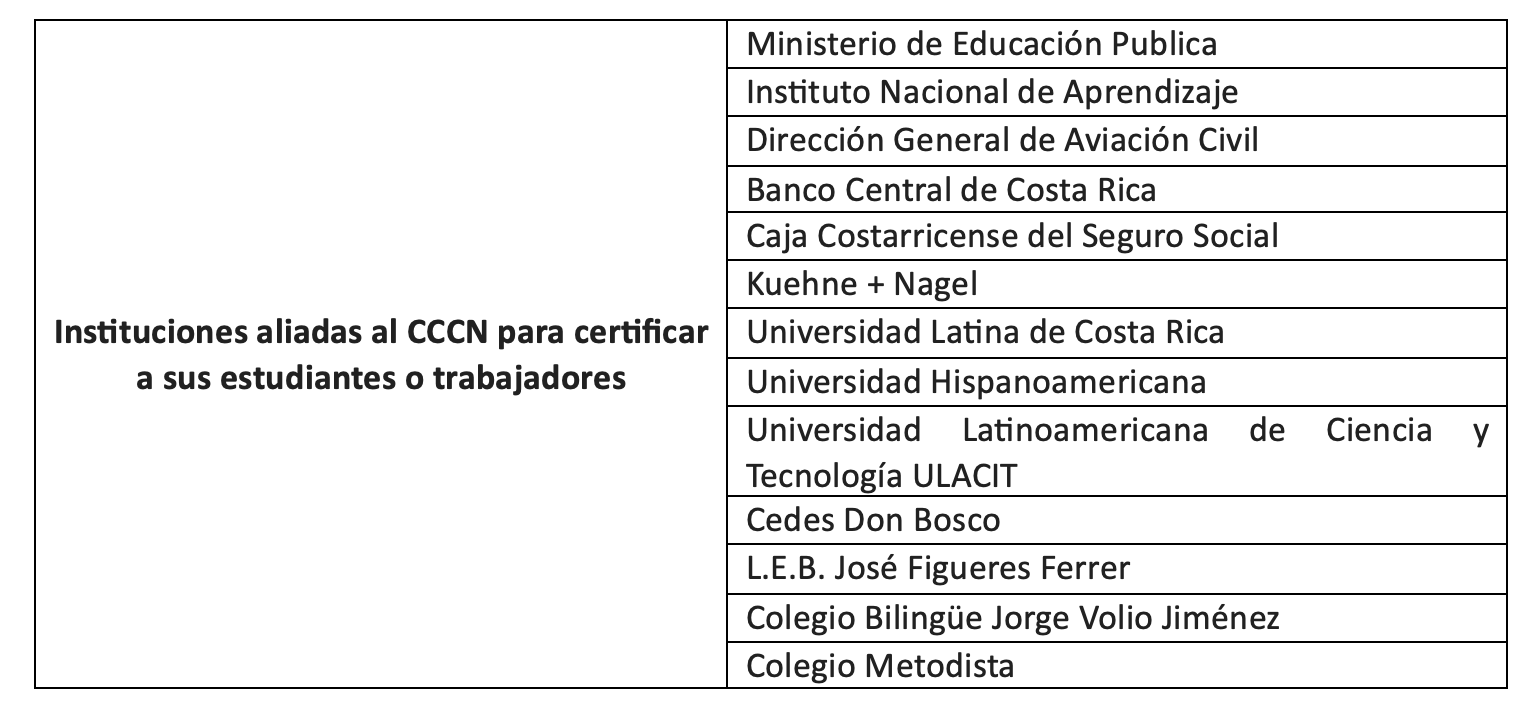 Esta realidad ha impulsado a centros de estudios, colegios y universidades, a buscar que sus estudiantes se gradúen con certificaciones del idioma para ampliar las posibilidades de que se coloquen en el mercado laboral. Por ejemplo, el Colegio Técnico Don Bosco y la Universidad Fidélitas forman parte de la lista de centros de enseñanza que ya han confiado en el CCCN para la aplicación de pruebas TOEIC®, así como organizaciones que certifican a sus trabajadores.
