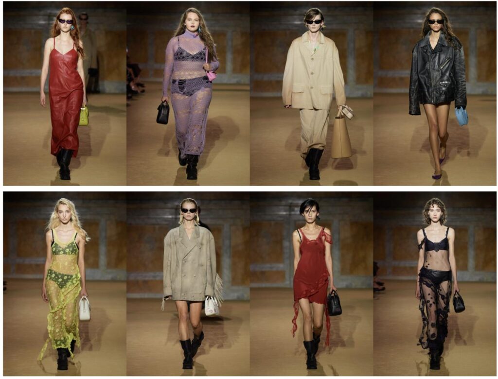 La colección también presentó vestidos lenceros transparentes y vestidos de punto desgastados y reparados, zurcidos y remendados a mano. Además, la colección introdujo una serie de camisetas y sudaderas universitarias estampadas con el gráfico de Donohue’s, el clásico asador del Upper East Side, reinventando su iconografía como un emblema deportivo. Los artículos de cuero y el calzado ofrecieron un contraste divertido y expresivo con las piezas tradicionales de la colección, introduciendo coloridas zapatillas de charol y zapatos planos de gelatina y nuevas versiones acolchadas de las Coach Shapes y el icónico bolso Coach Tabby. Además, Vevers exploró versiones de cuero de siluetas de bolsos cotidianos, incluido un bolso bowling y un bolso tipo cesta de gran tamaño.