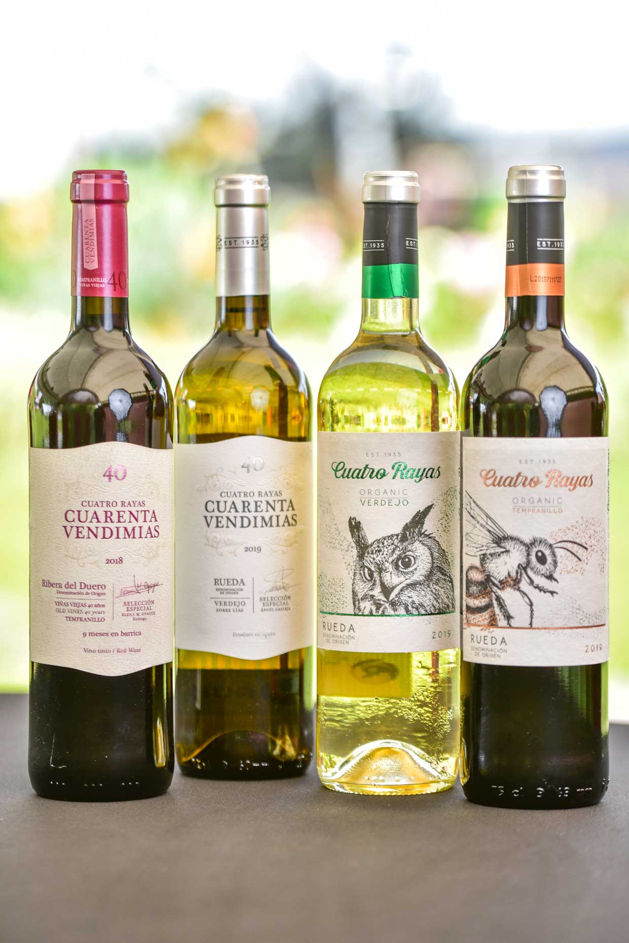 • Cuatro Rayas Organic Verdejo: es un vino que en boca es persistente, donde se aprecian notas amarillo pajizo con reflejo verdosos y brillante. Su aroma fresco y fruta cítrica son muy característicos. Ideal para acompañar con pescado, mariscos frescos y pasta.