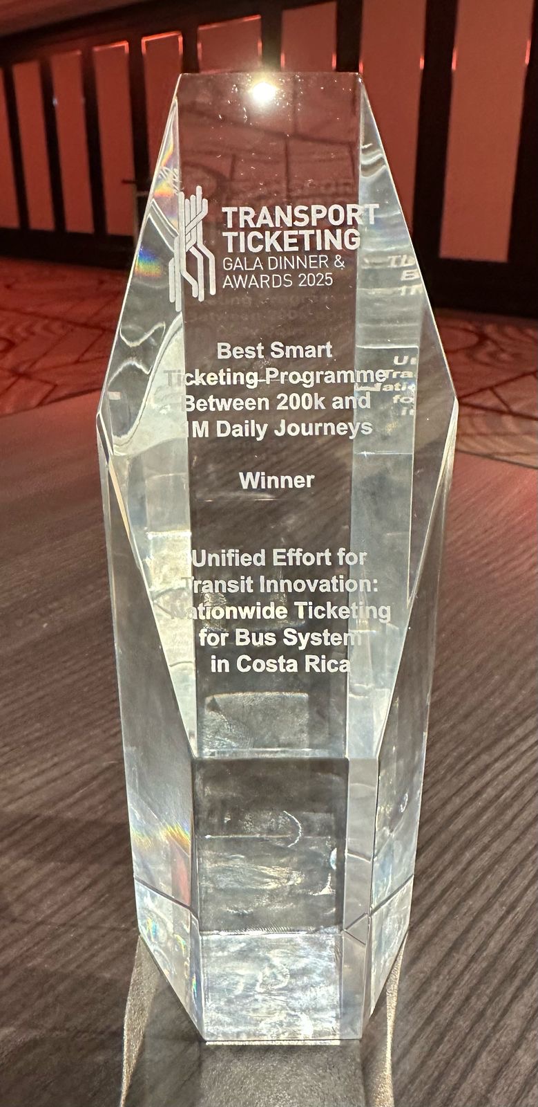 Reconocimiento que ganó Costa Rica en los los Transport Ticketing Global Awards 2025, por la iniciativa de pago electrónico en autobuses.