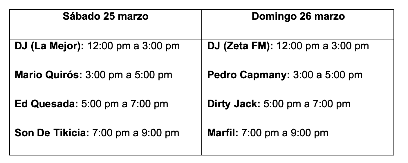 La propuesta musical estará a cargo de Djs y artistas nacionales con variedad de géneros como electrónica, rock y música bailable, a partir de la 1 p.m. y hasta las 9 p.m.