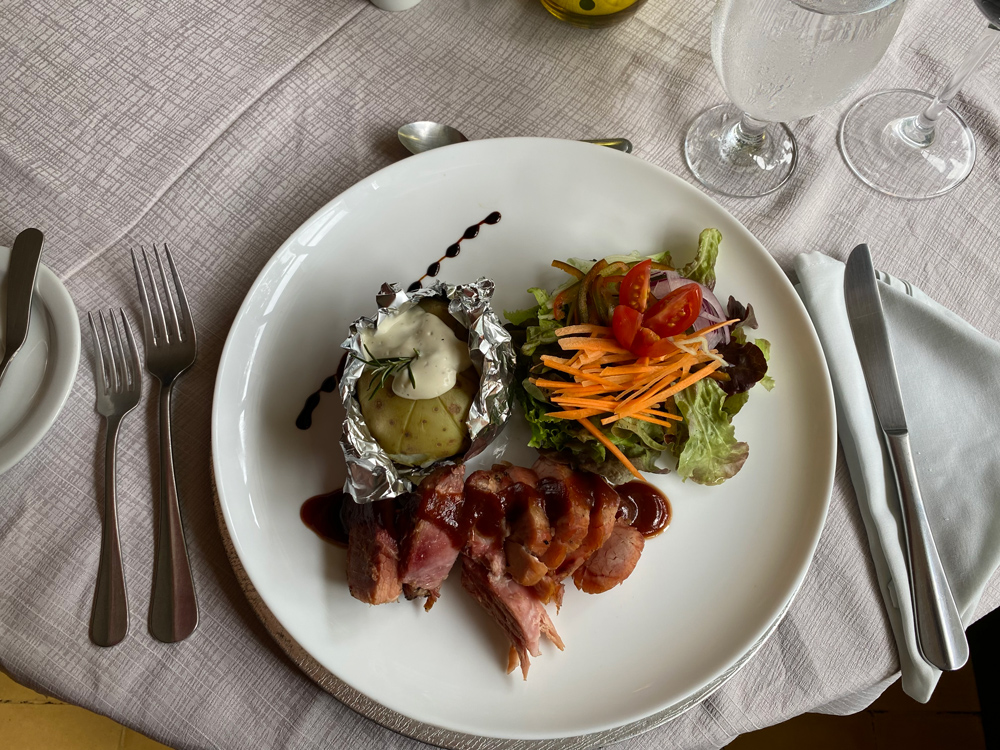 Como platos fuertes, el chef propone una pierna de cerdo jamonada en salsa agridulce, acompañado de papa asada y ensalada mixta o pechuga de pago en costra de manzanas y nueces en salsa gravy, acompañado de puré de papa y camote y vegetales a la parrilla, por un precio de US$38.