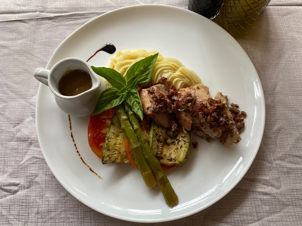 Pechuga de pavo en costra de manzanas y nueces en salsa gravy.