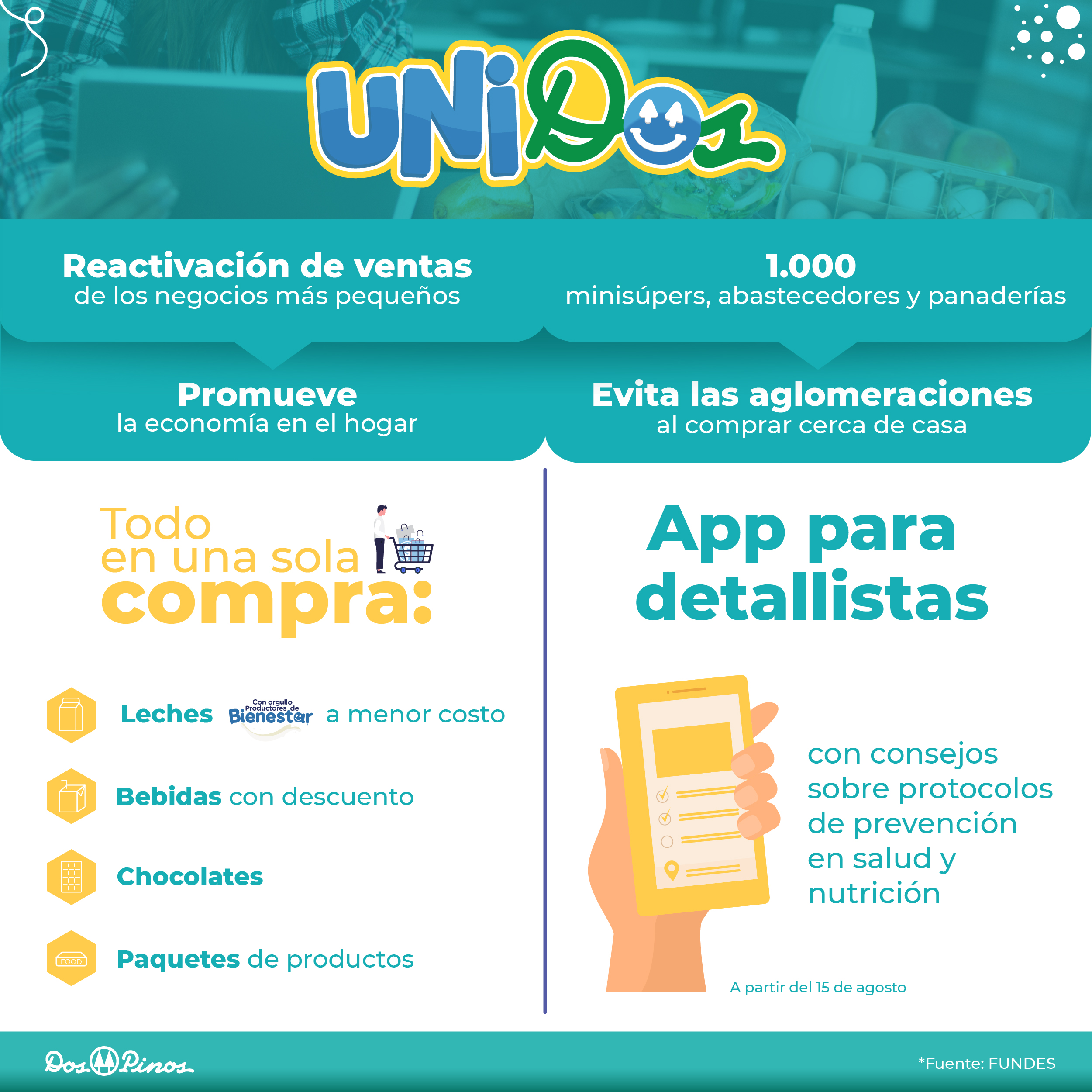 El programa UniDOS busca incentivar y fortalecer la relación del consumidor con su detallista más cercano a casa, y al mismo tiempo promover la economía de los hogares con productos de uso cotidiano, de excelente calidad y a muy buenos precios. De esta forma las personas pueden evitar las aglomeraciones al comprar en comercios cercanos a sus barrios y comunidades.
