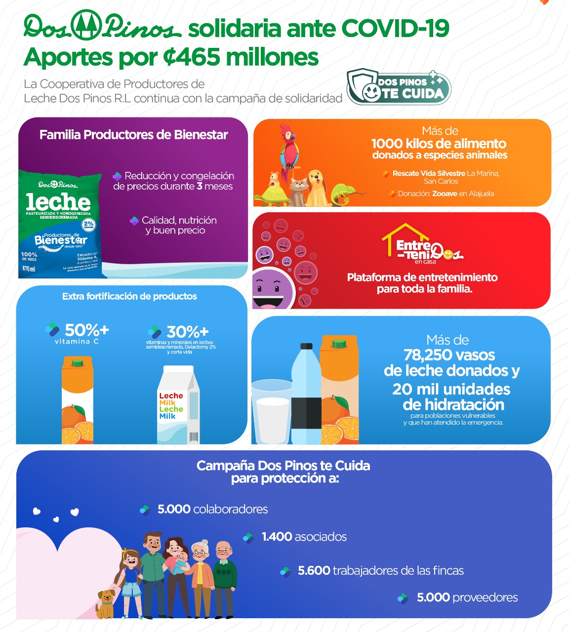 Con el congelamiento de precios, desde este 18 de mayo, se pretende ayudar a los consumidores a enfrentar los efectos del fuerte impacto económico y social provocado por la pandemia.  Así las familias dispondrán de productos de calidad con precios y tamaños más económicos, que permitan disminuir los gastos, manteniendo la nutrición y calidad que ofrecen los productos Dos Pinos.