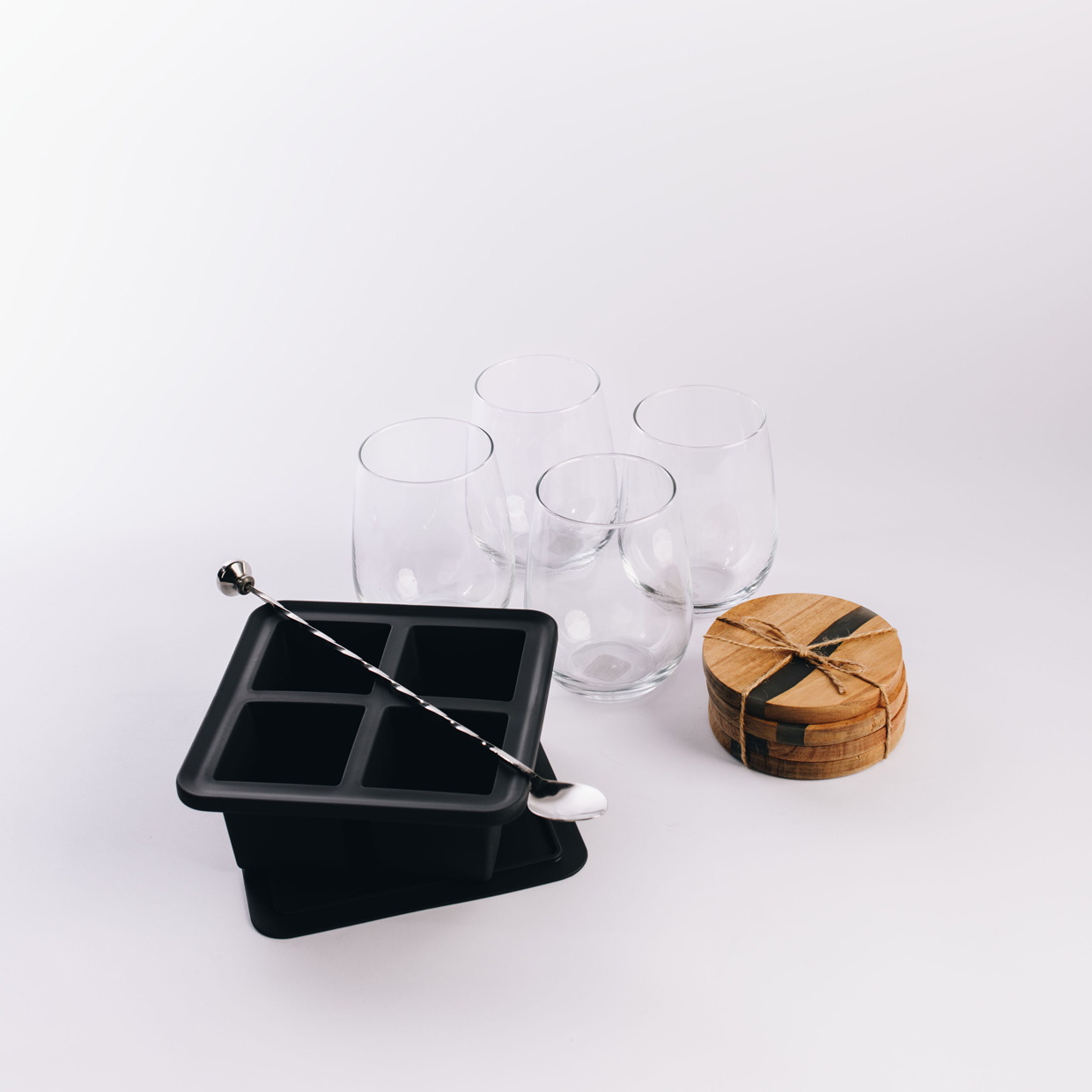 Holiday Toast : Copas sin tallo Porta vasos de madera Cuchara coctelera Molde para hielo.